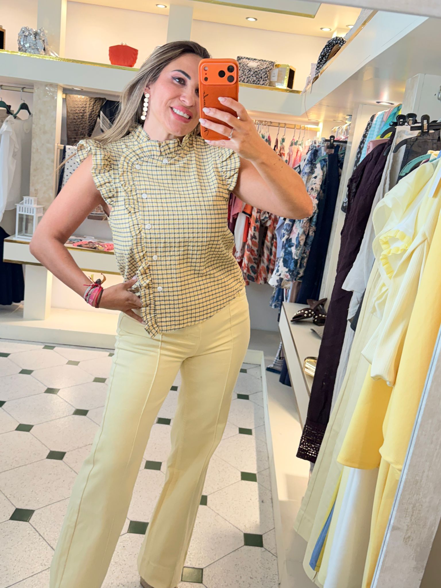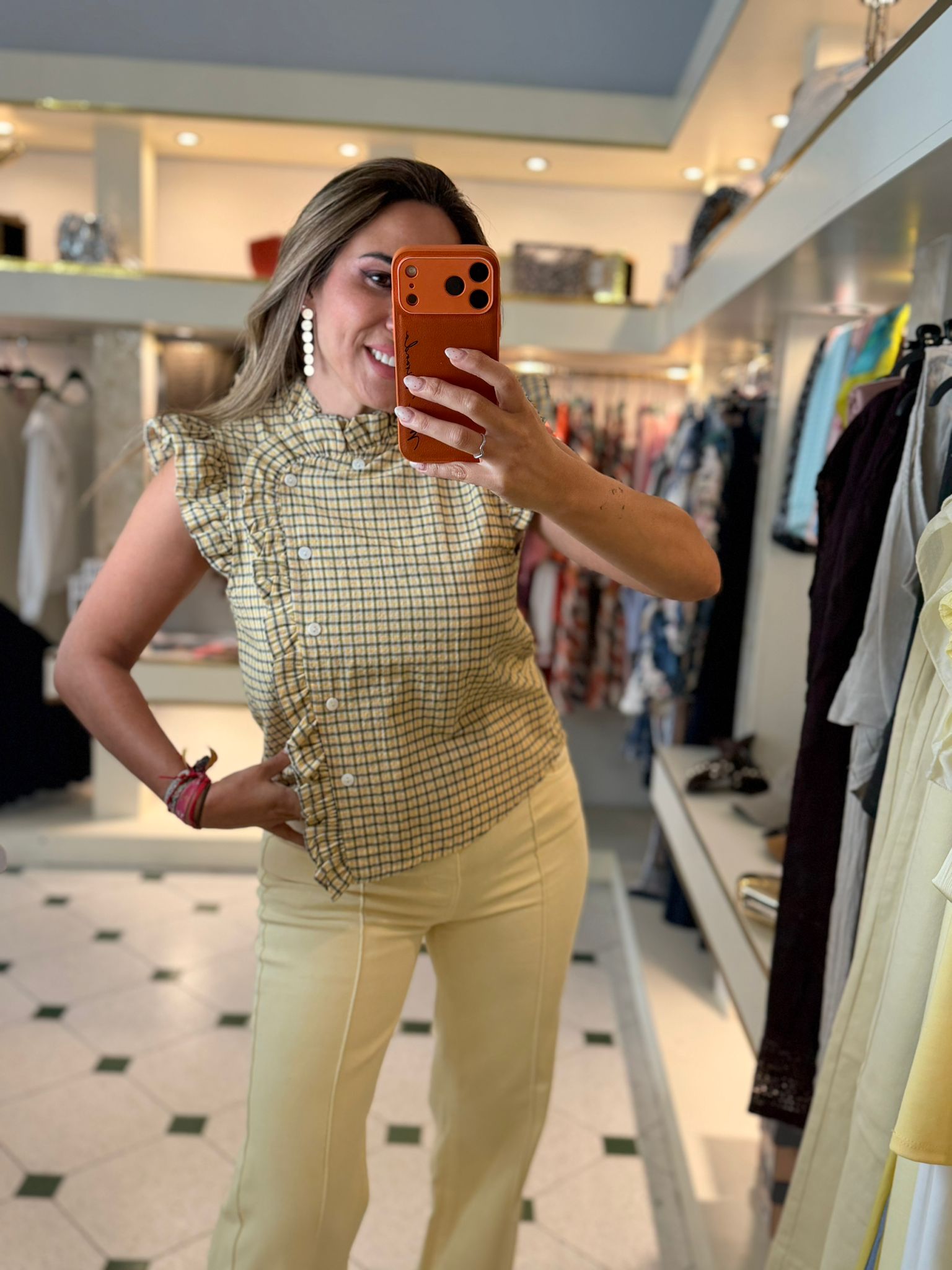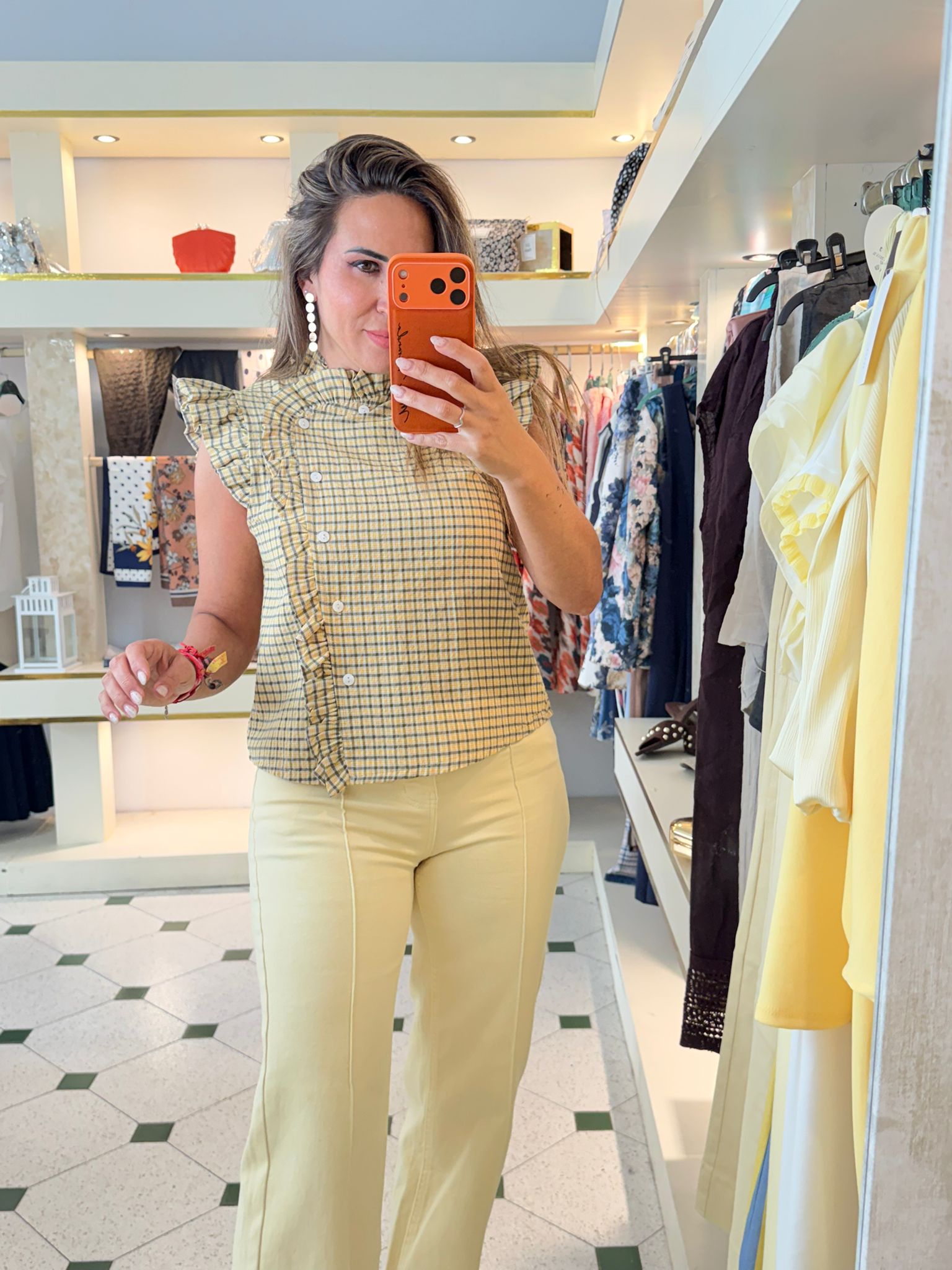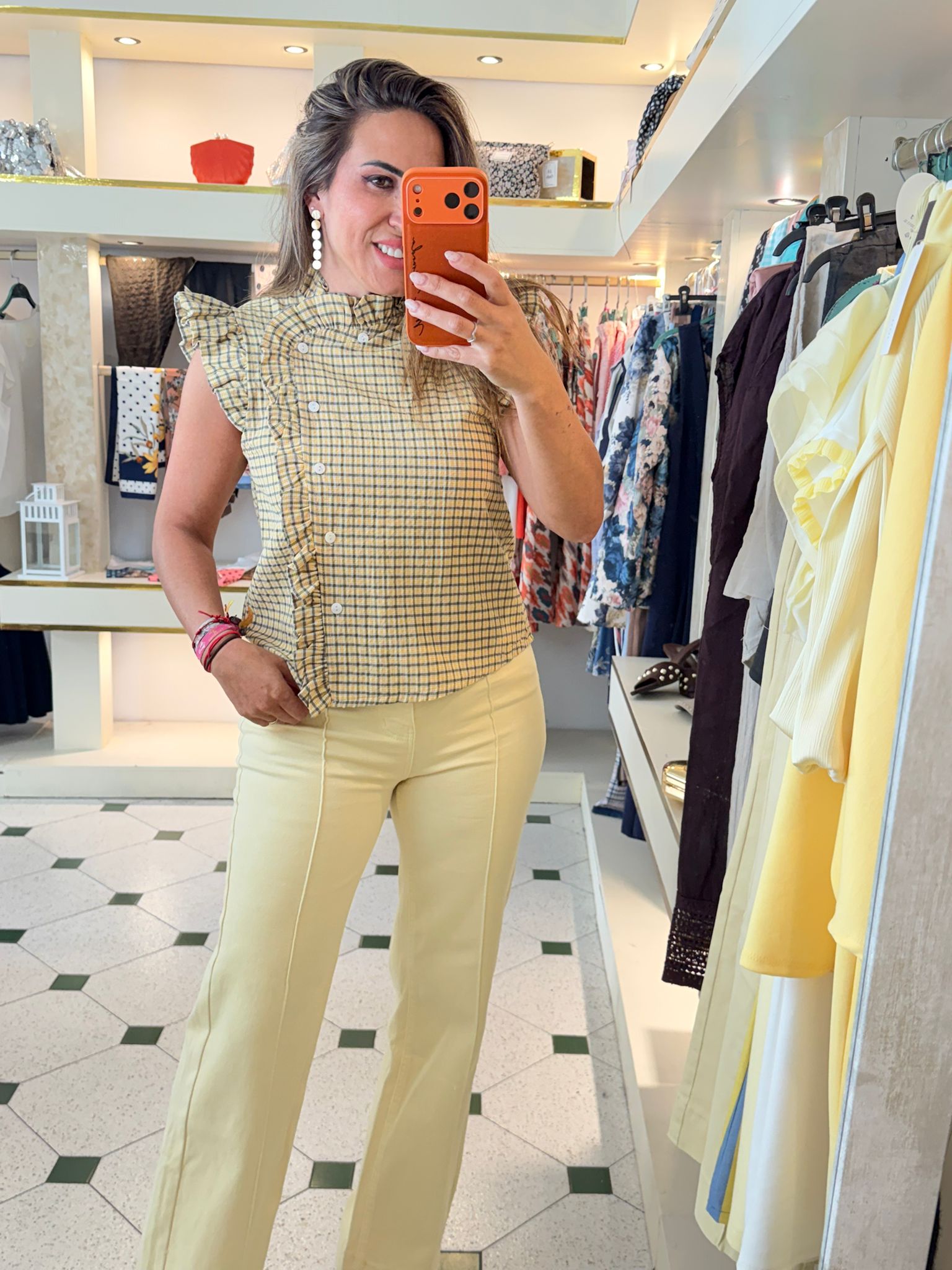 Camisa lateral, con detalle de cuadros y volante en la aleta. Talla única (tallan de la S a la L).
