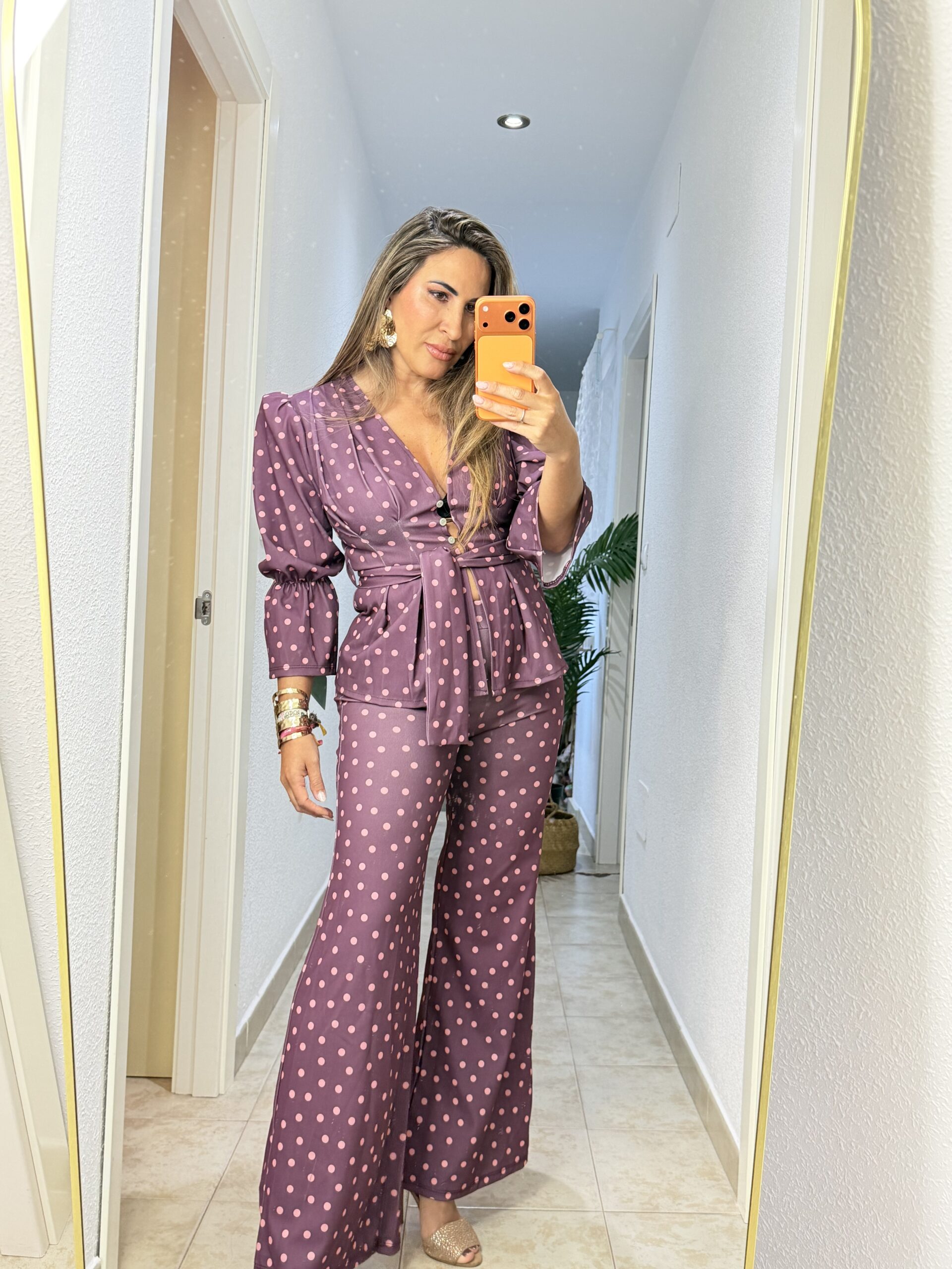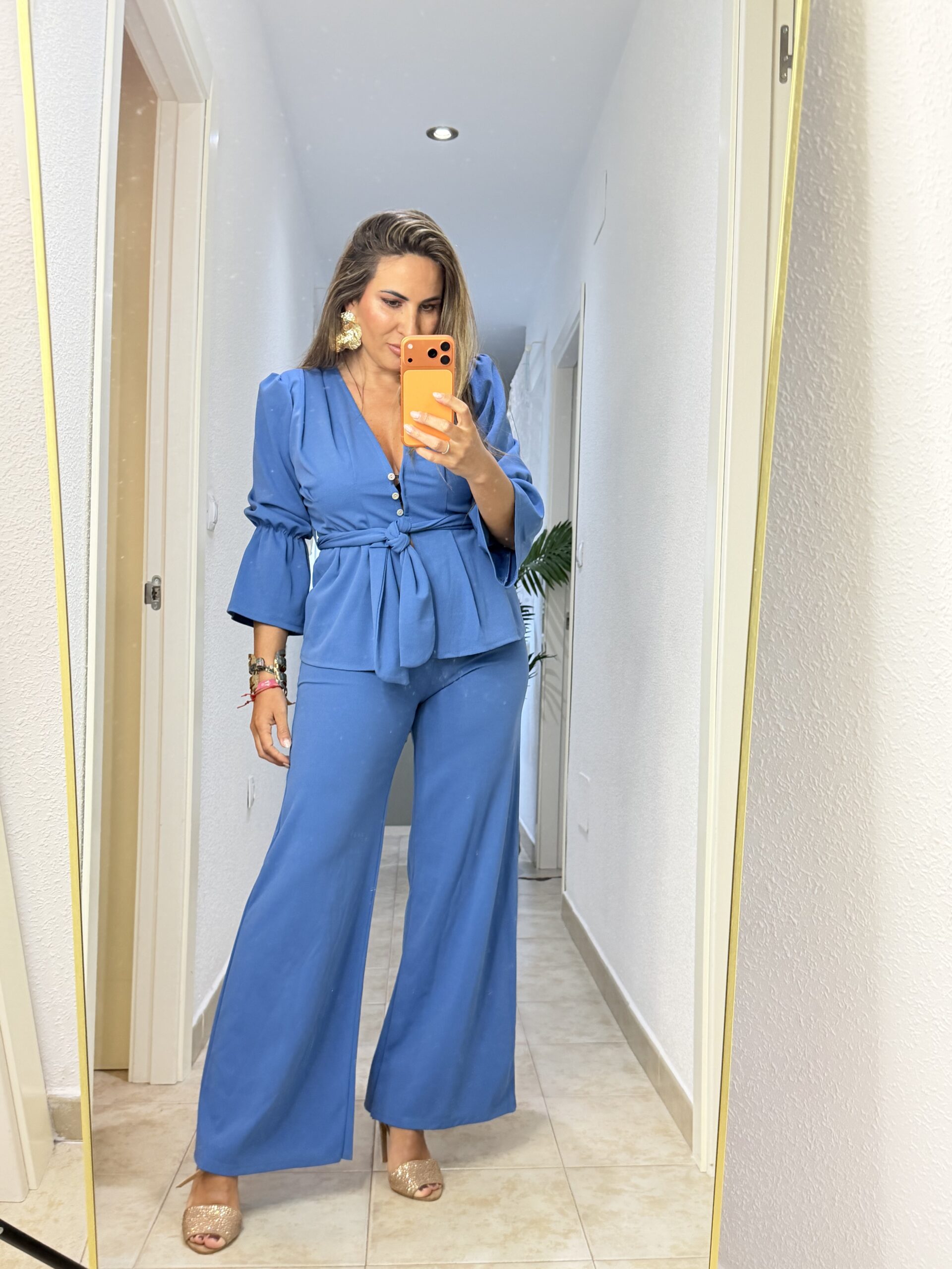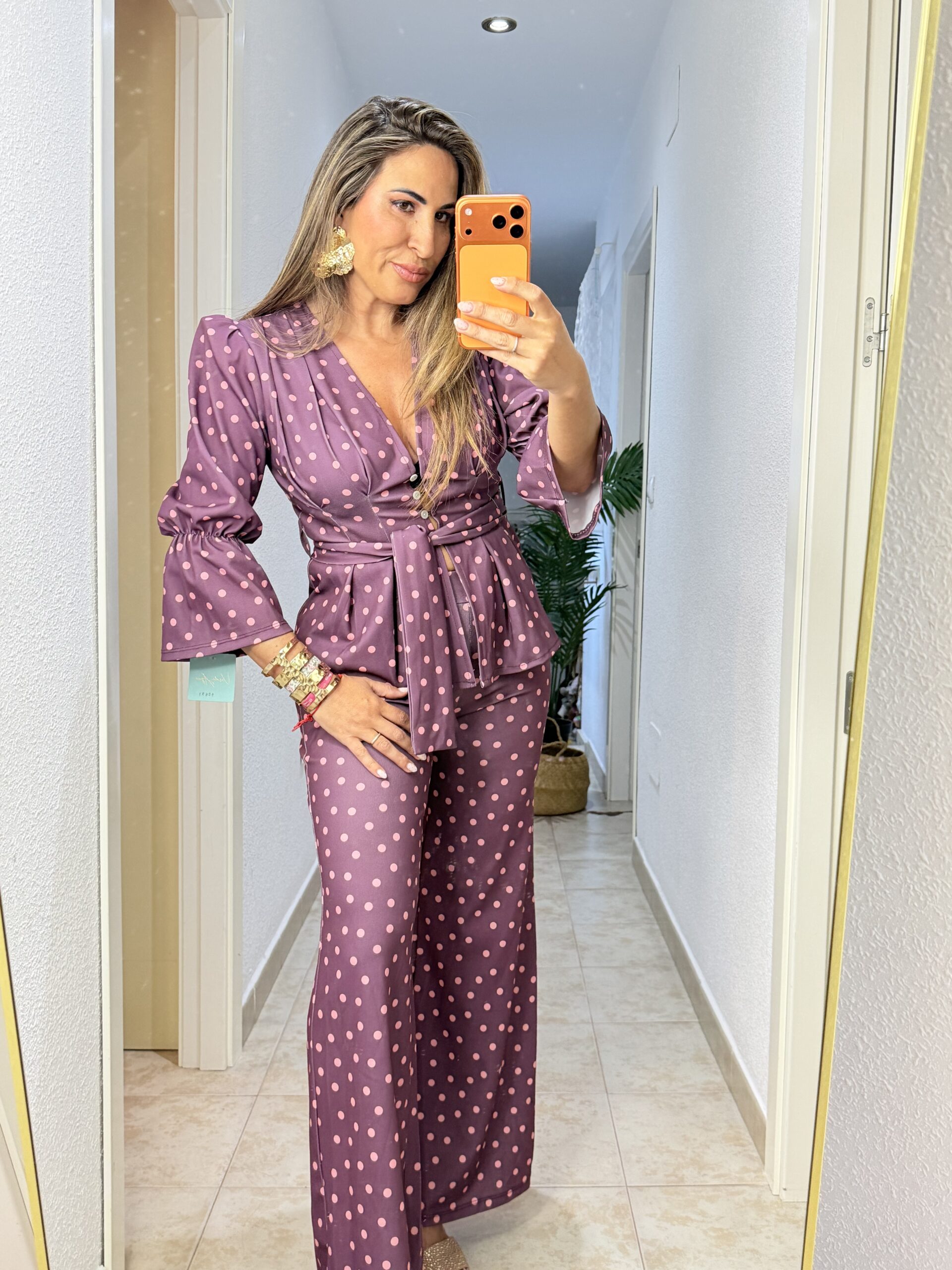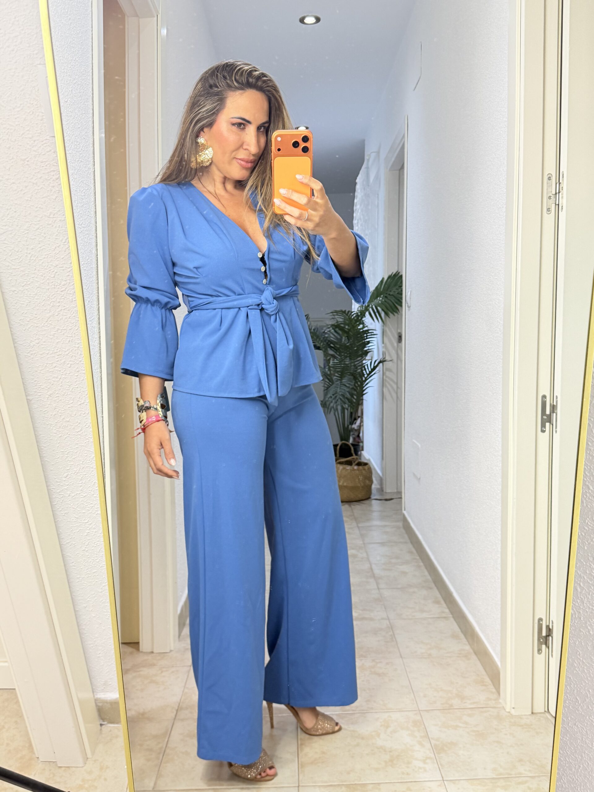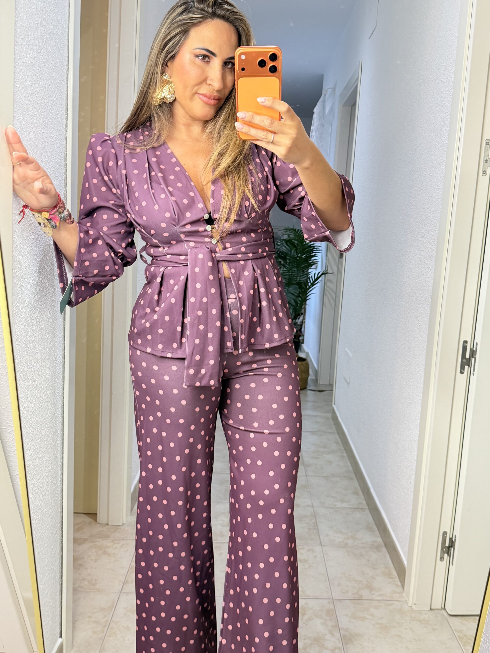 Compra ahoraConjunto de dos piezas talla única con chaqueta manga farol y lazo de cinturón al mismo tono.