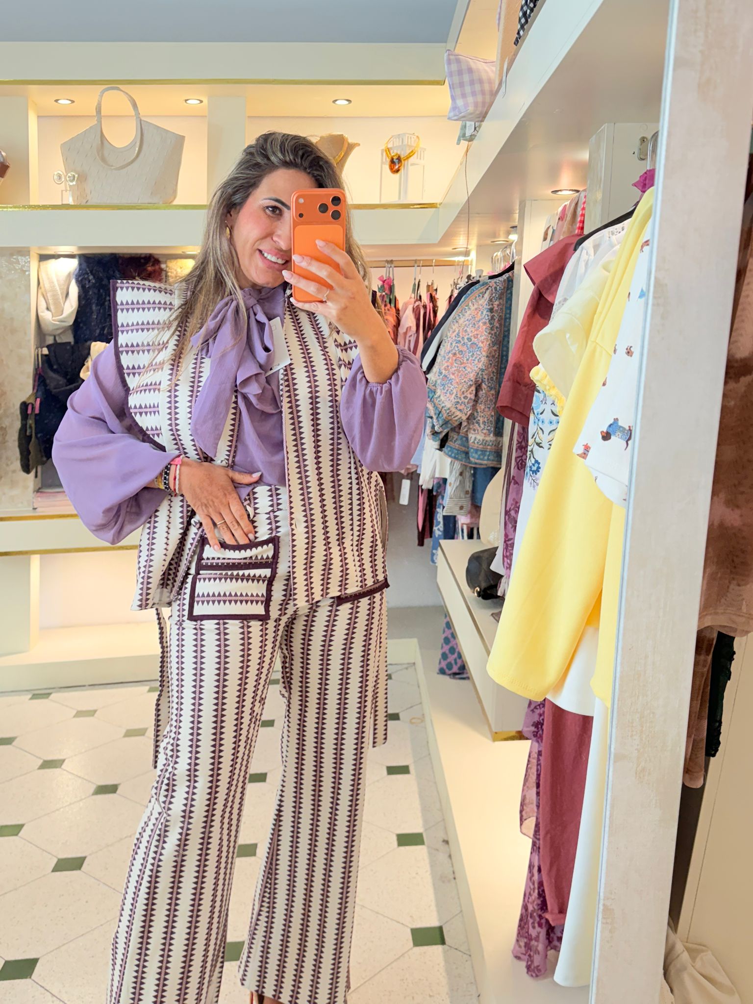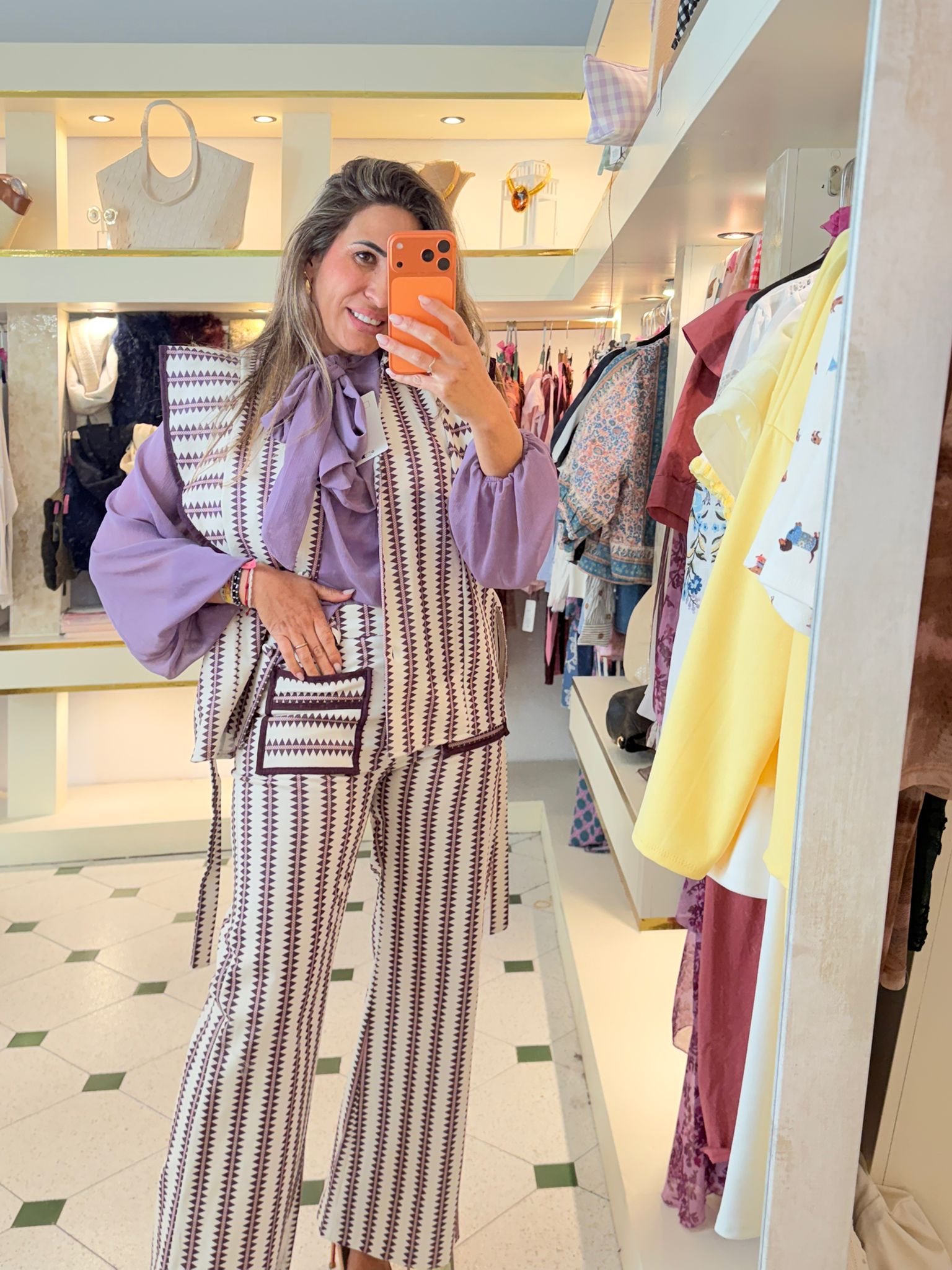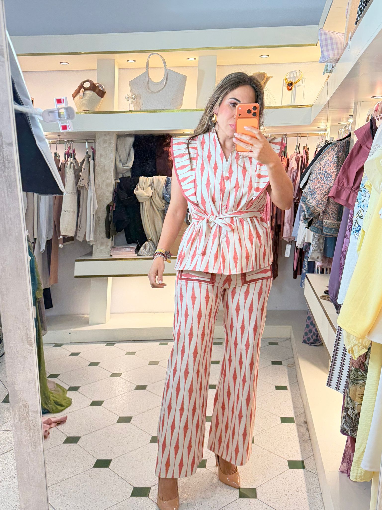 Conjunto Irene, detalle de chaleco con pantalón por el tobillo. Bolsillos delanteros y botones.