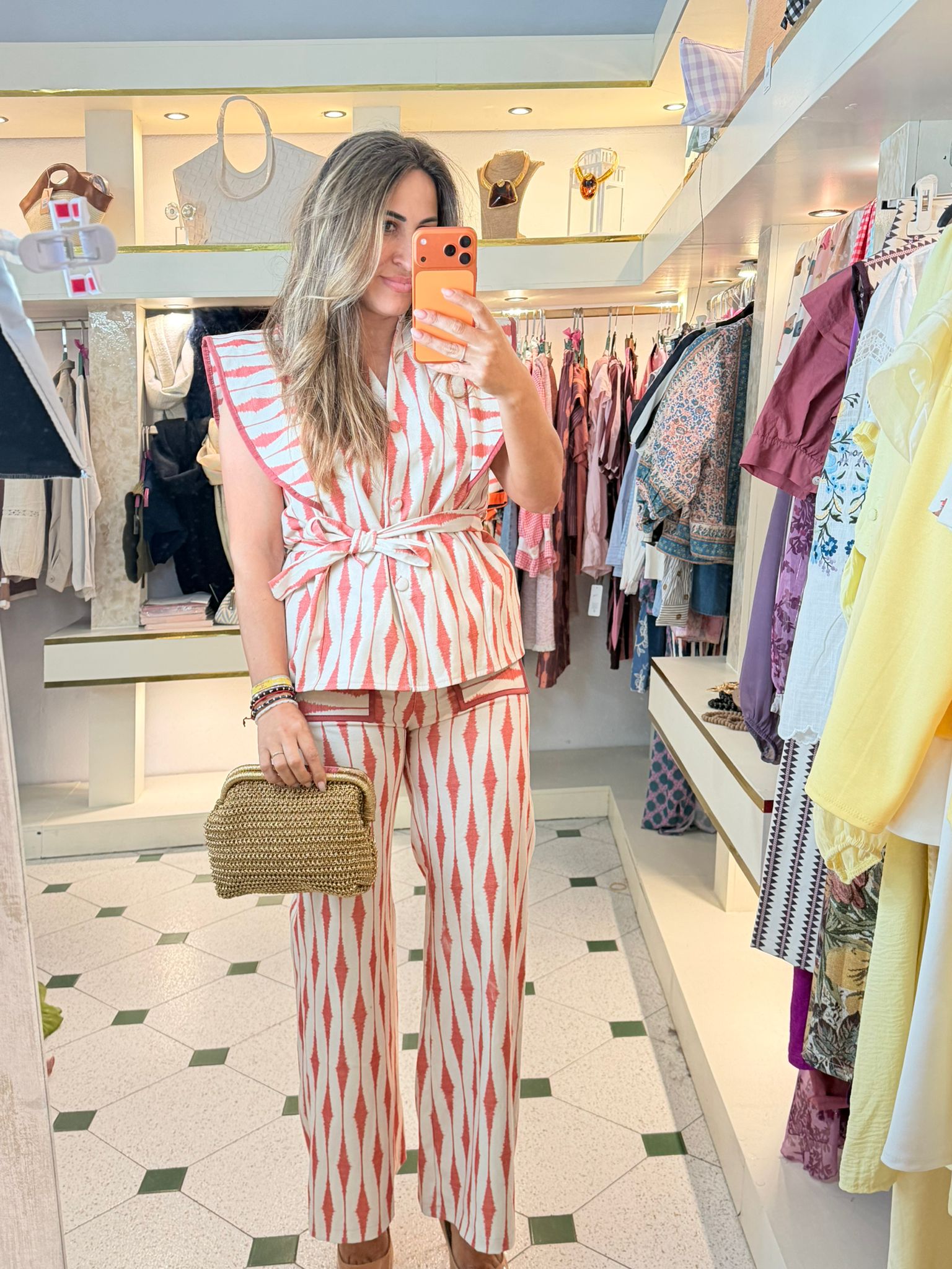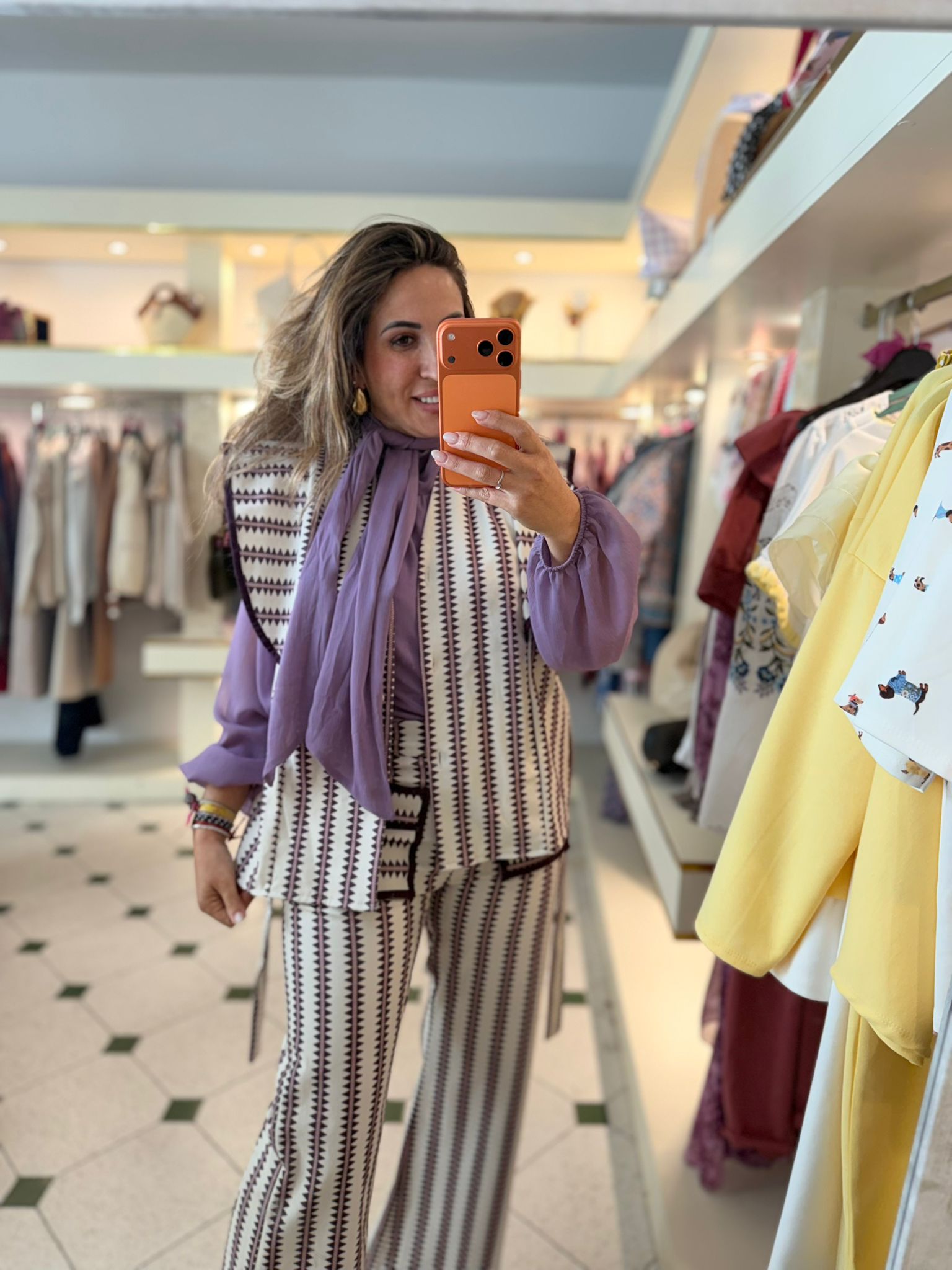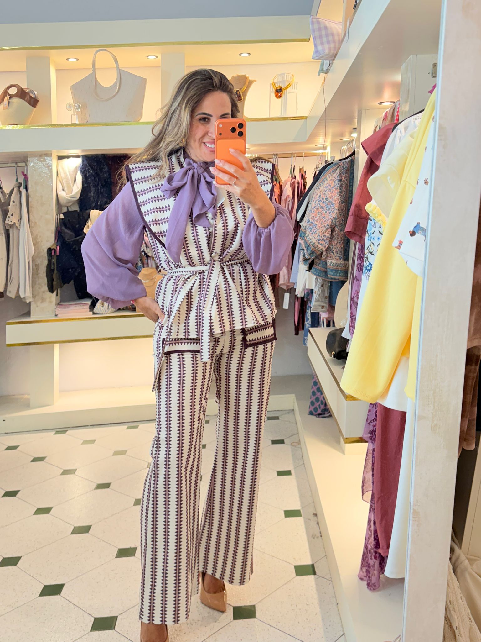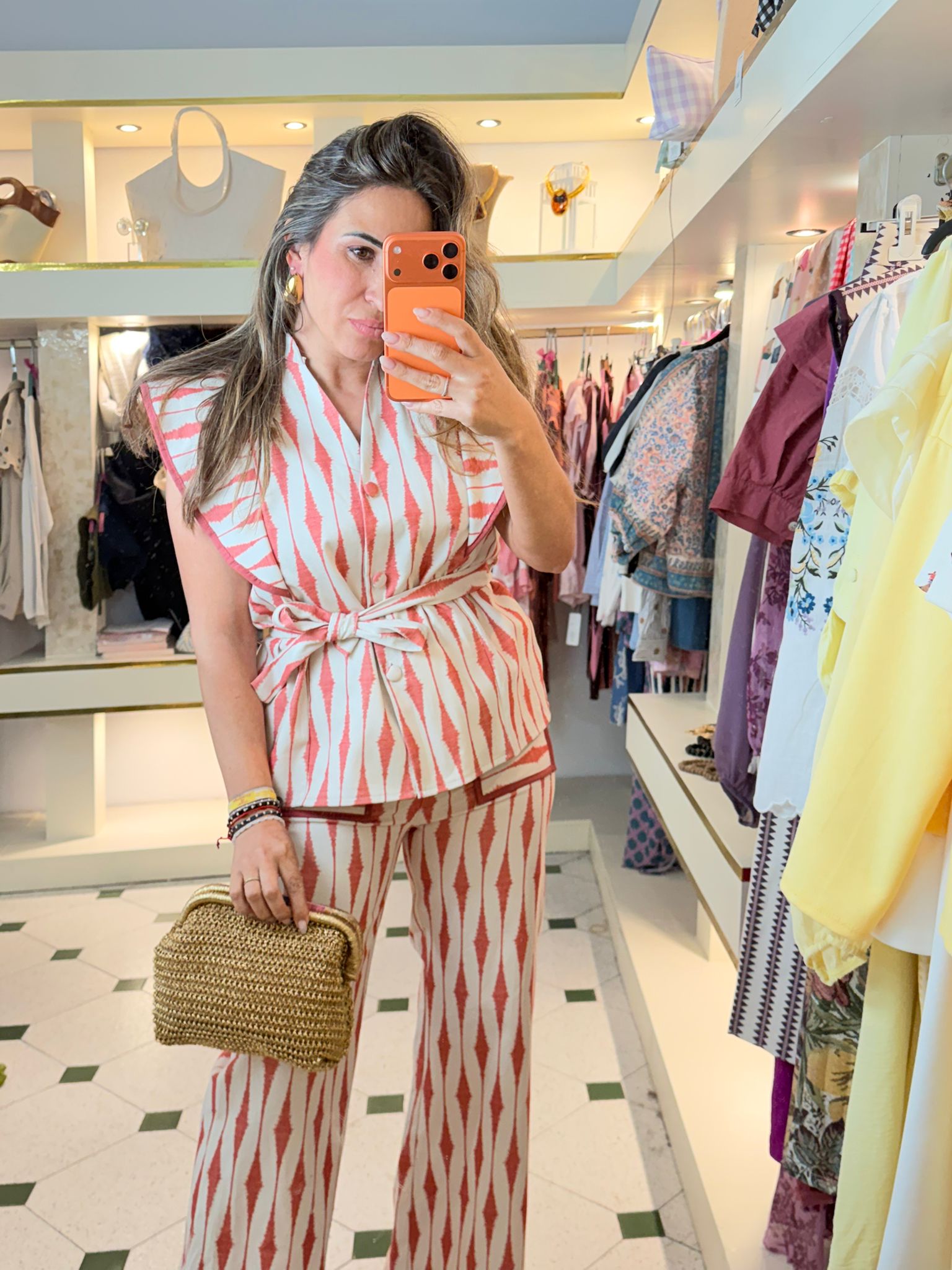 Conjunto Irene, detalle de chaleco con pantalón por el tobillo. Bolsillos delanteros y botones.