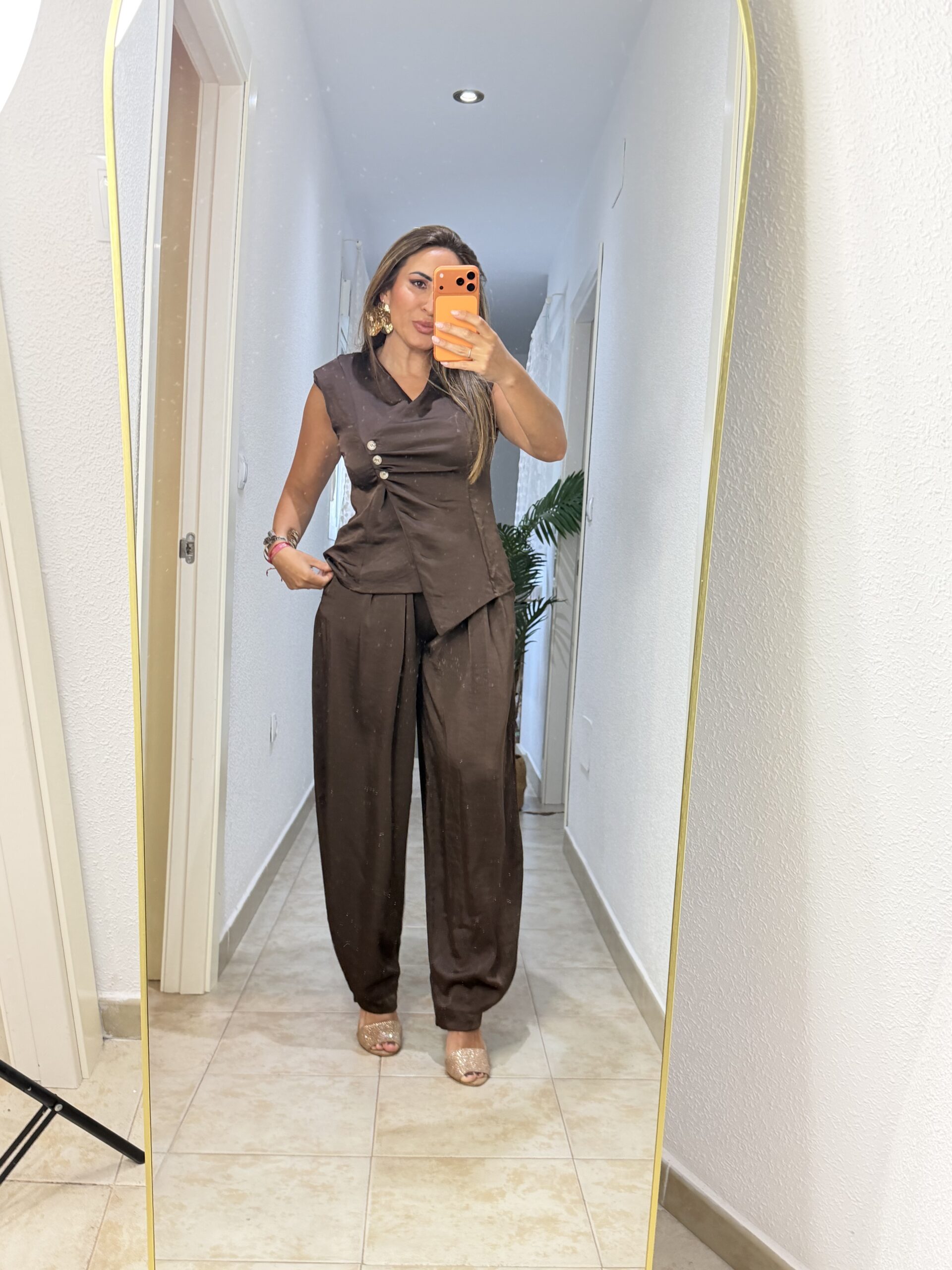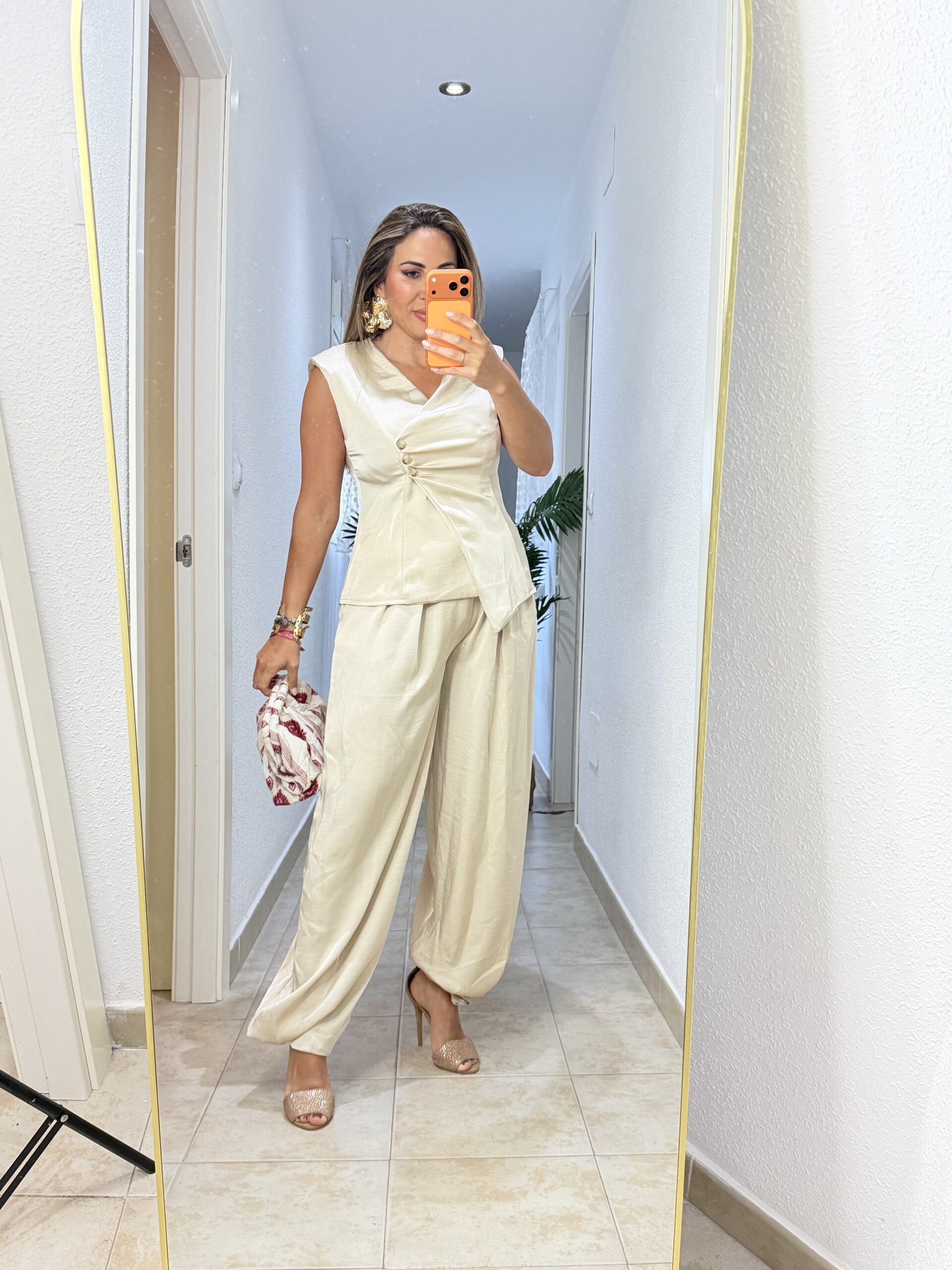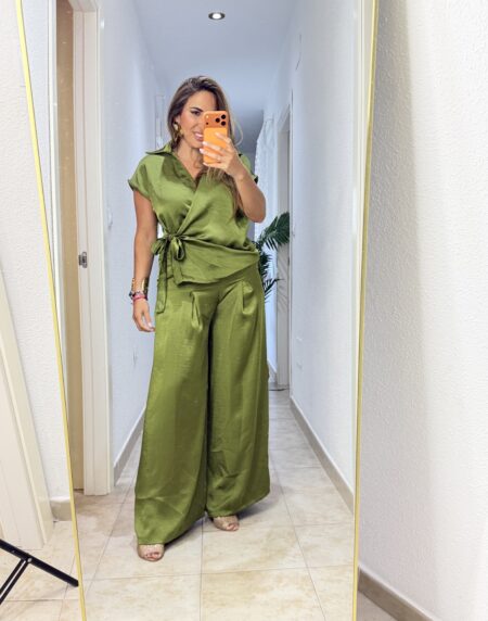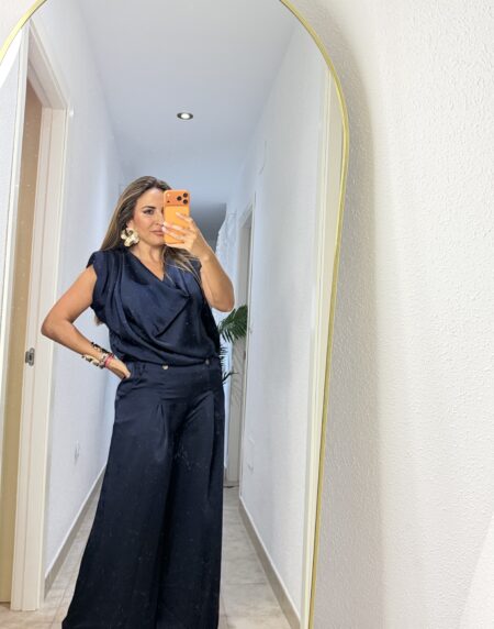 Conjunto de dos piezas pantalón y chaleco, muy elegante con detalle de 3 botones y poco lateral. De seda natural, caído.