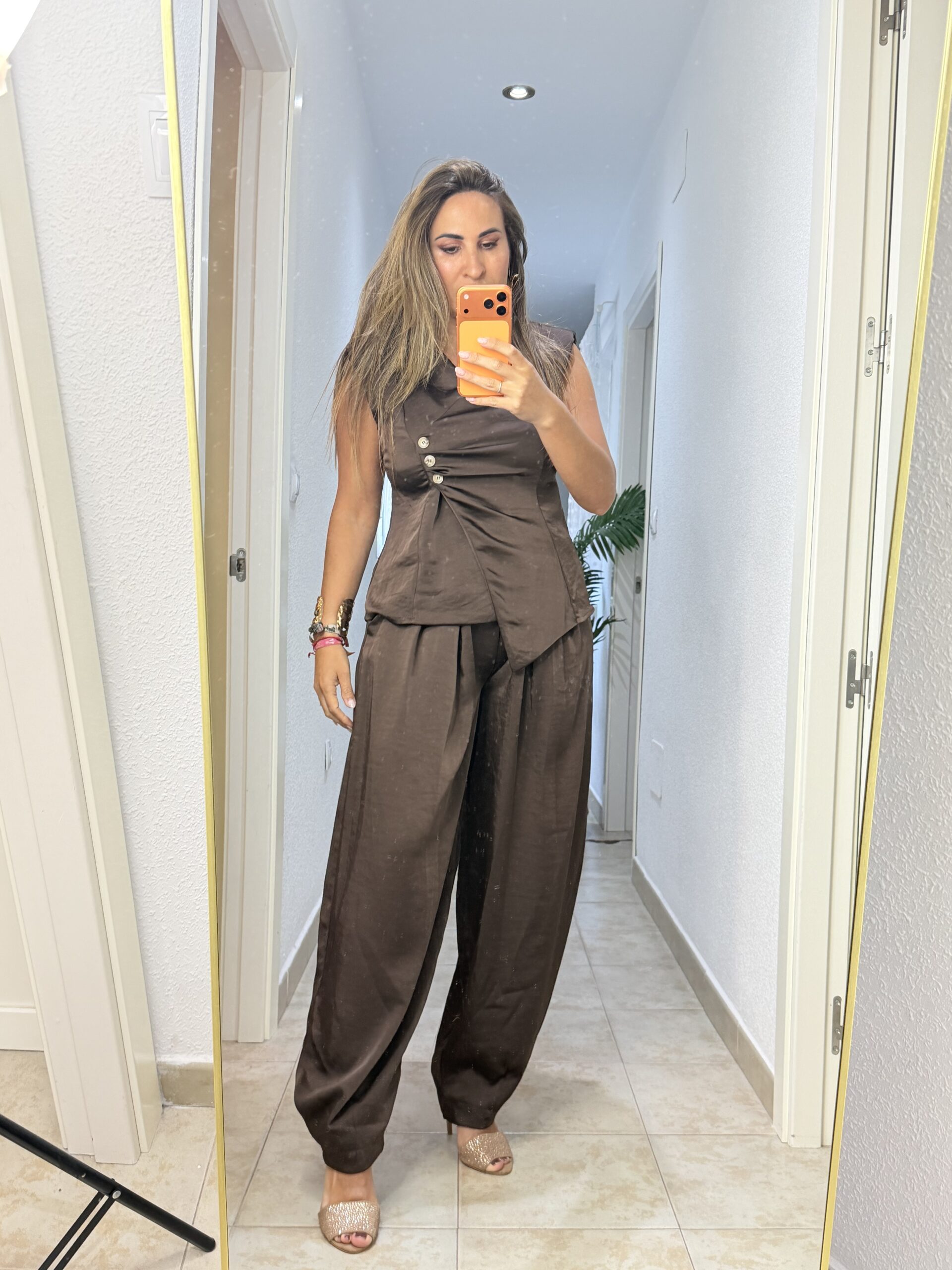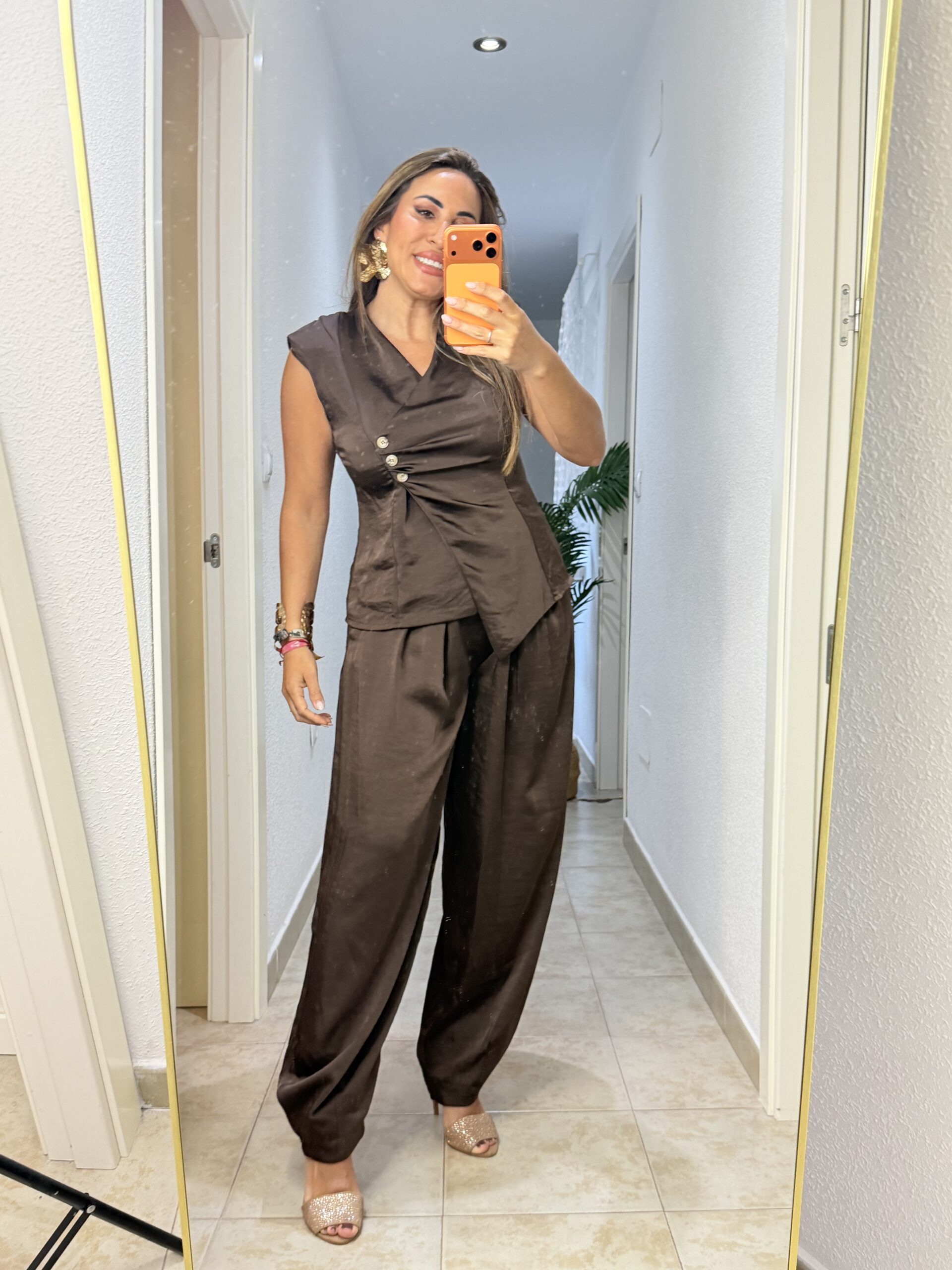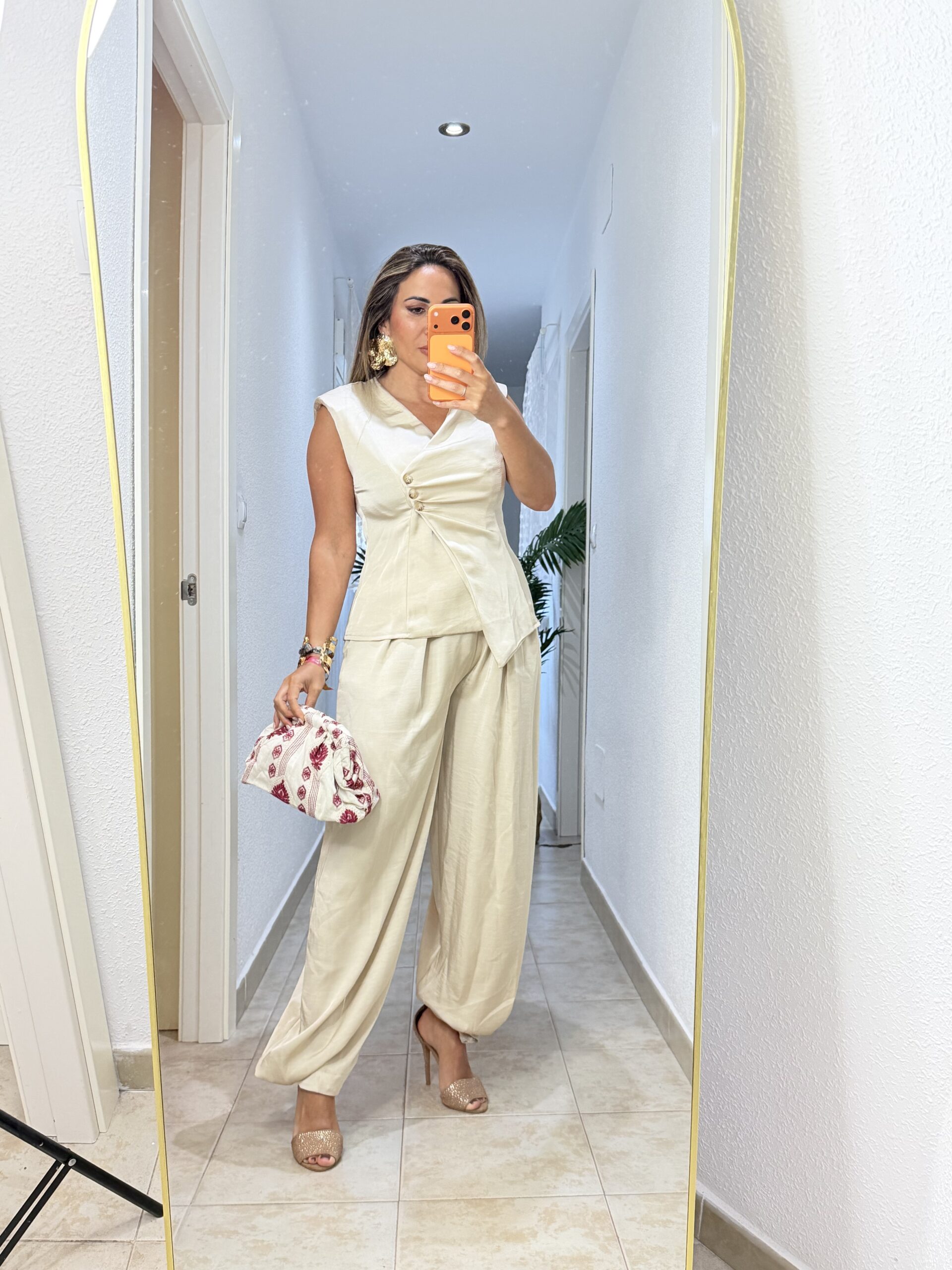 Conjunto de dos piezas pantalón y chaleco, muy elegante con detalle de 3 botones y poco lateral. De seda natural, caído.