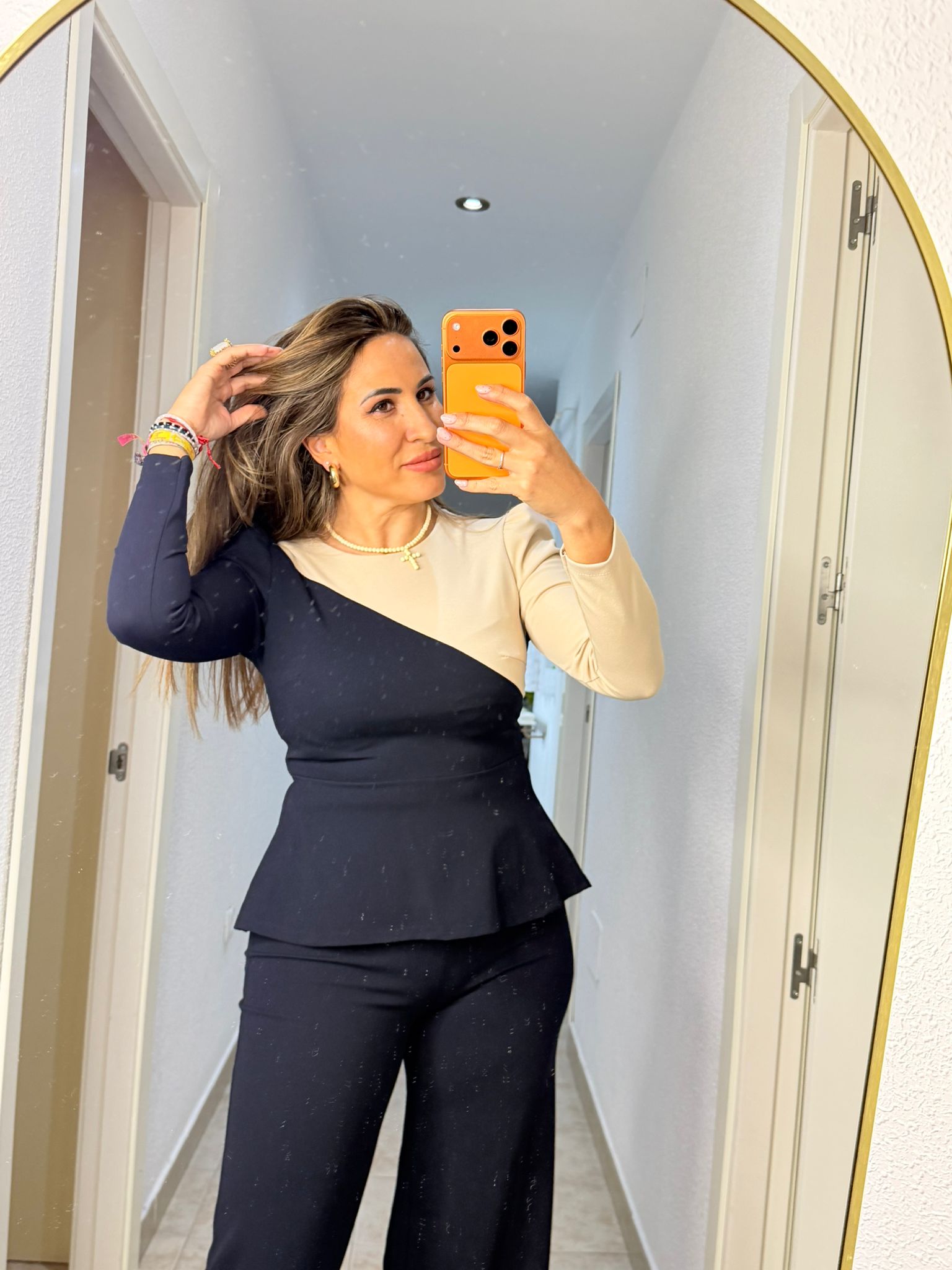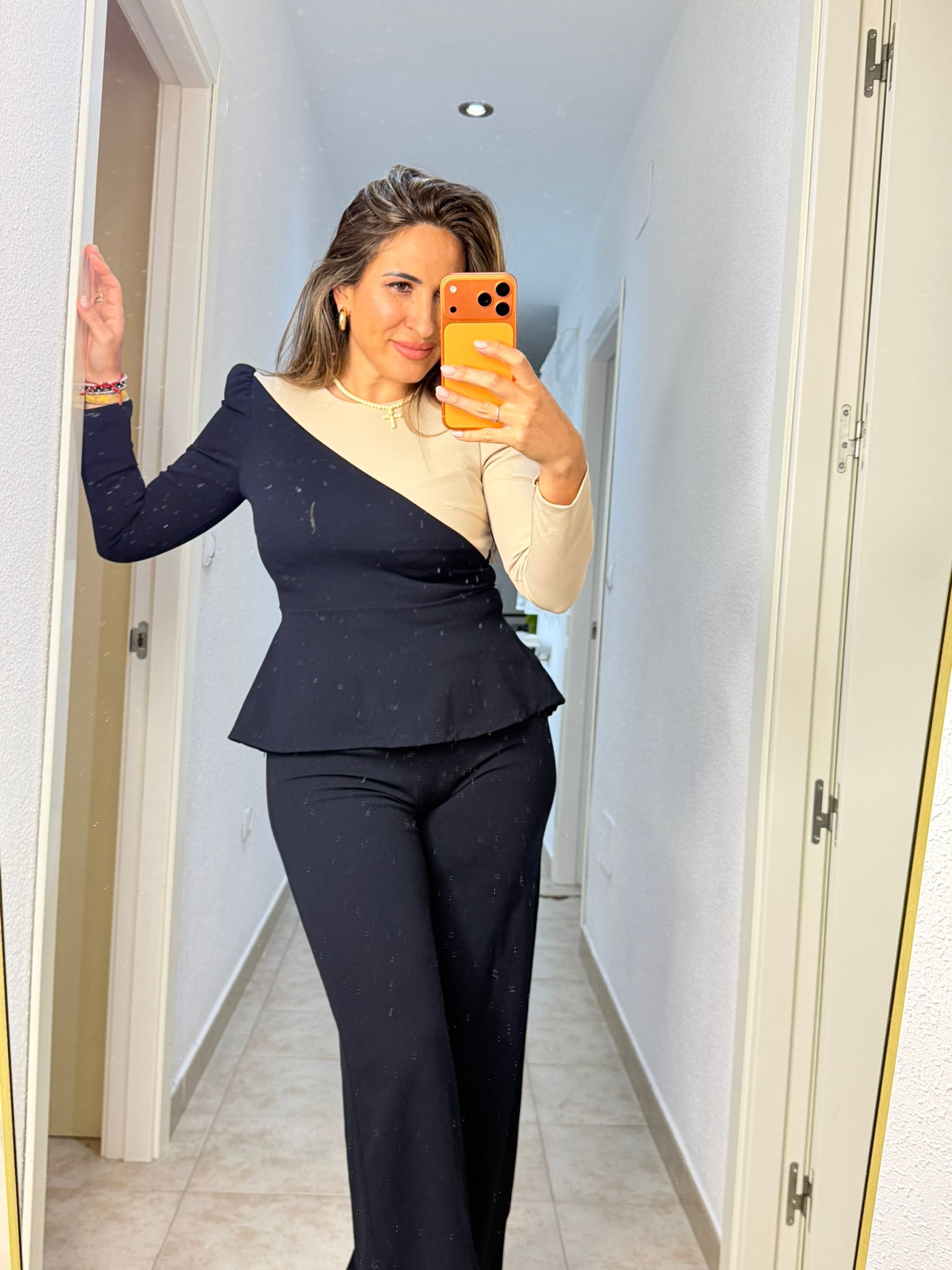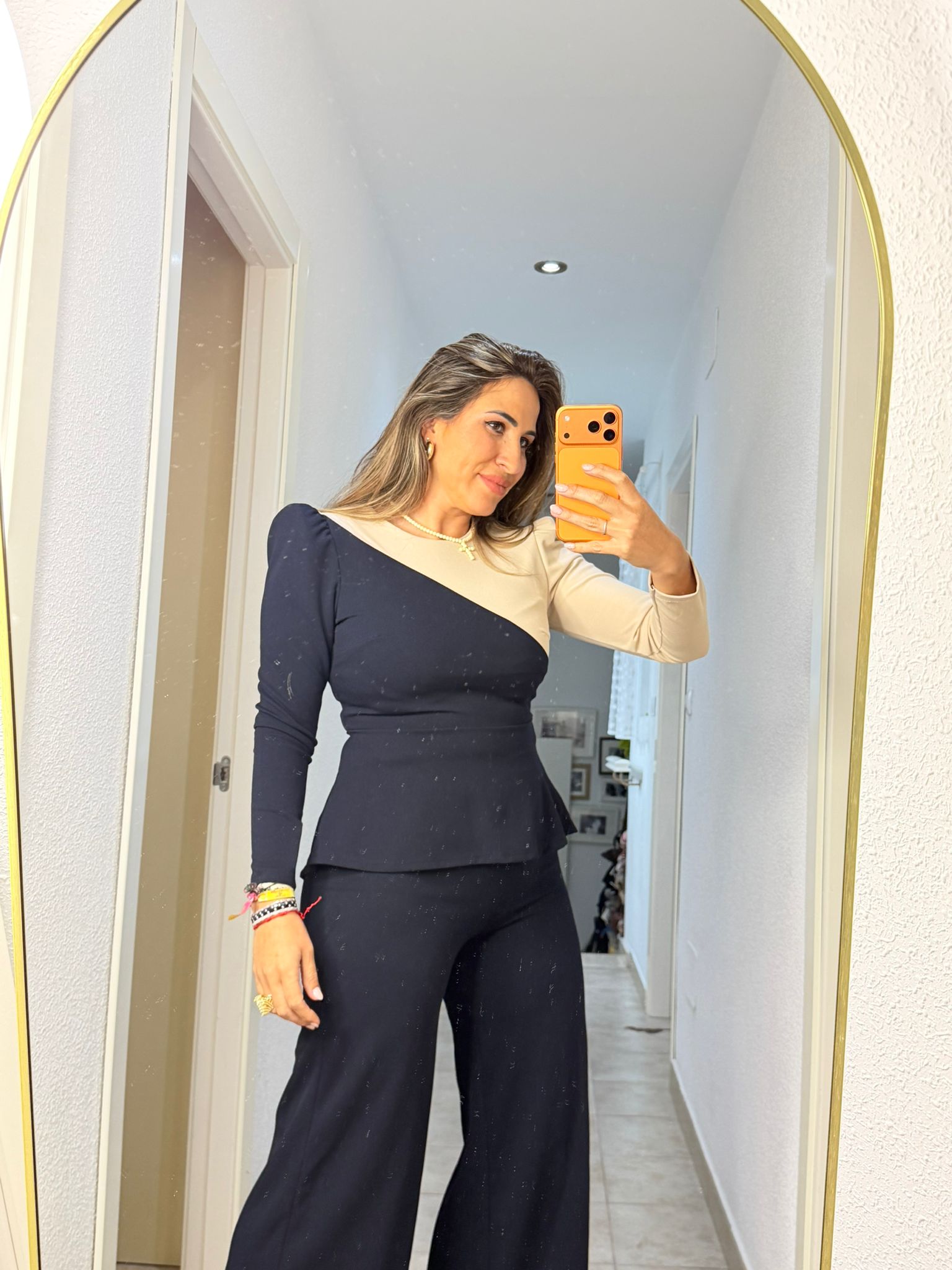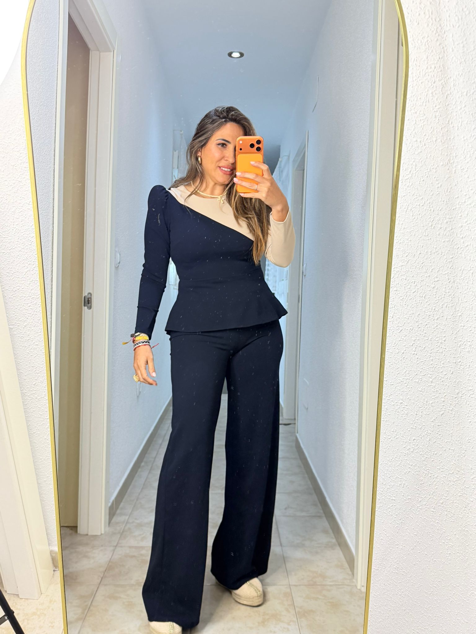 Conjunto María con detalle de corte en el pecho y pantalón elastano, largo tipo recto. Color azul marino y talla única (tallan de la S a la L).