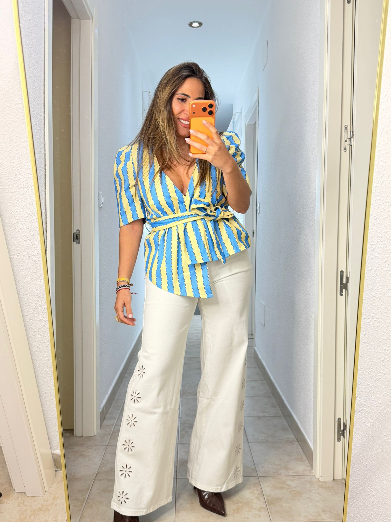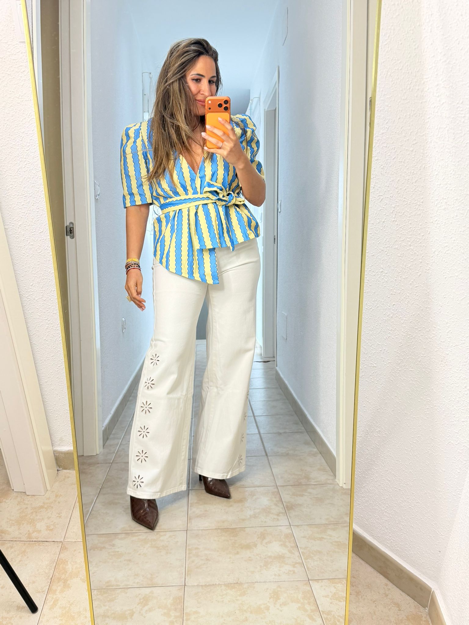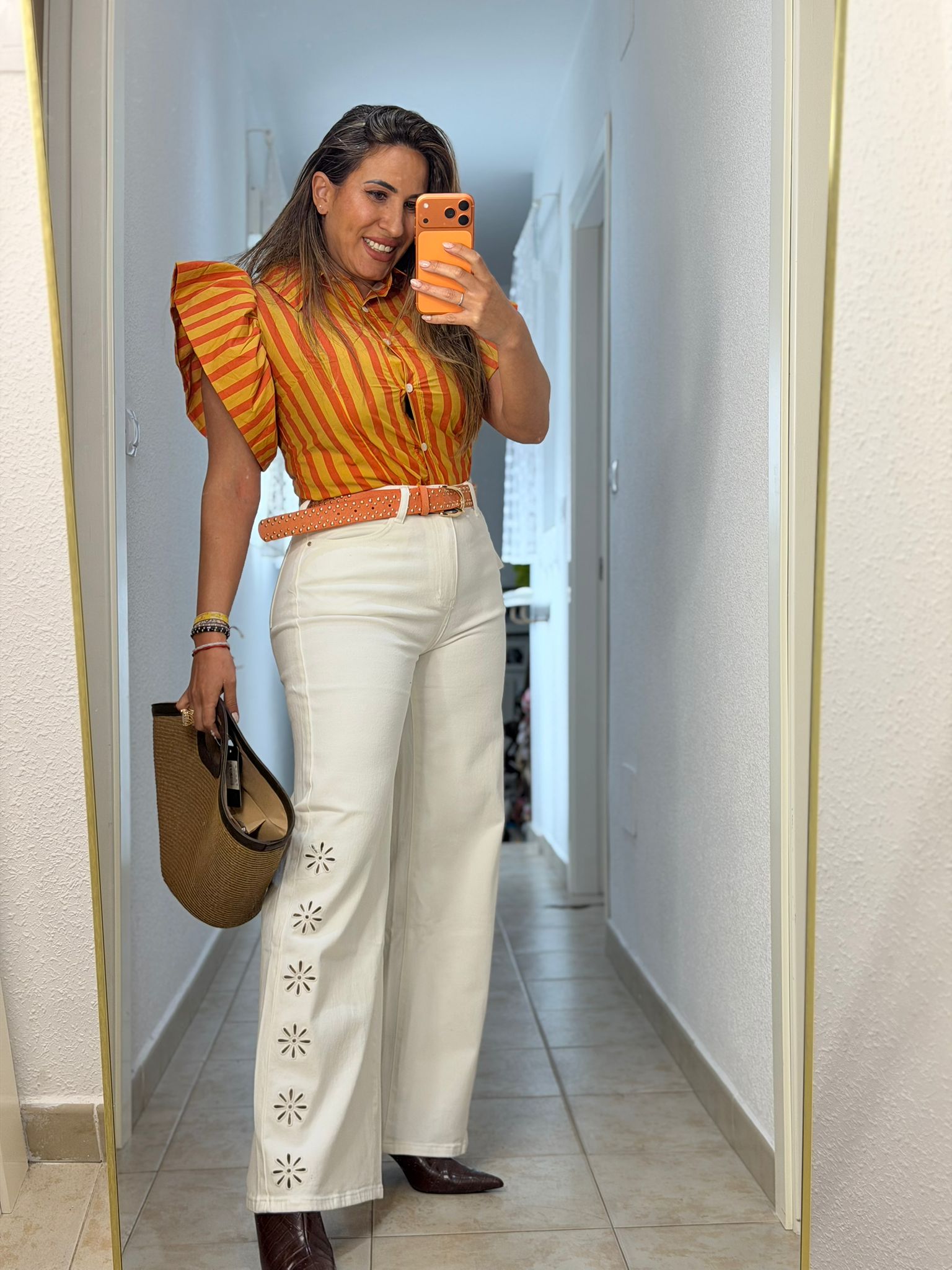 Pantalón blanco con flores perforadas en el lateral bajo. Alta calidad. Tipo vaquero, no trasparente.