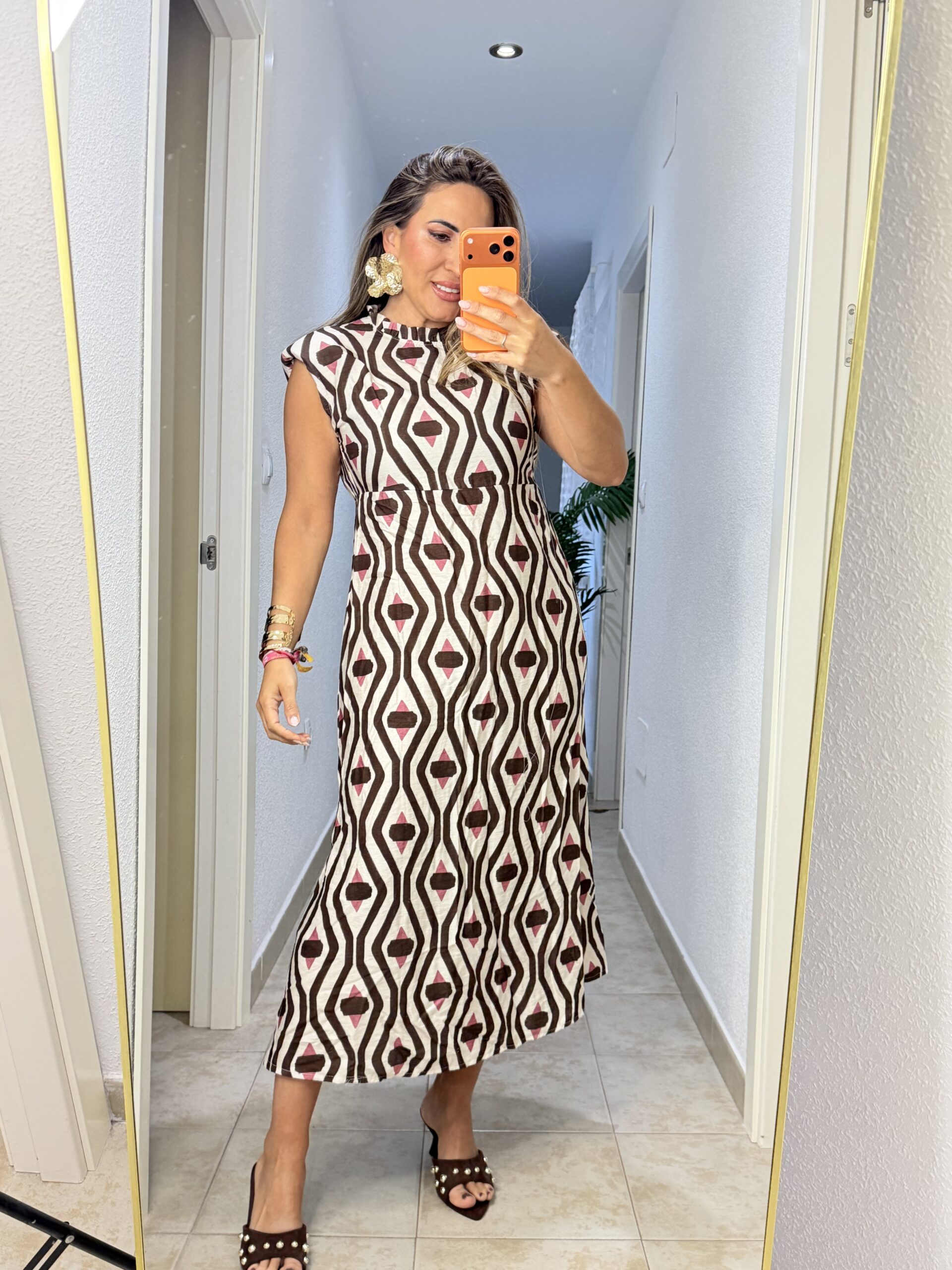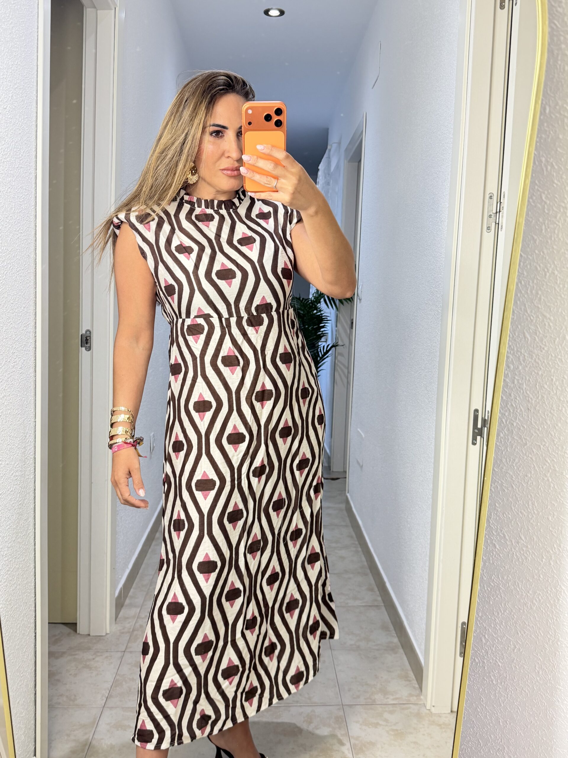Vestido tipo lino con detalle de corte debajo del pecho. Talla única (tallan de la S a la XL), contorno de pecho 99 cm.