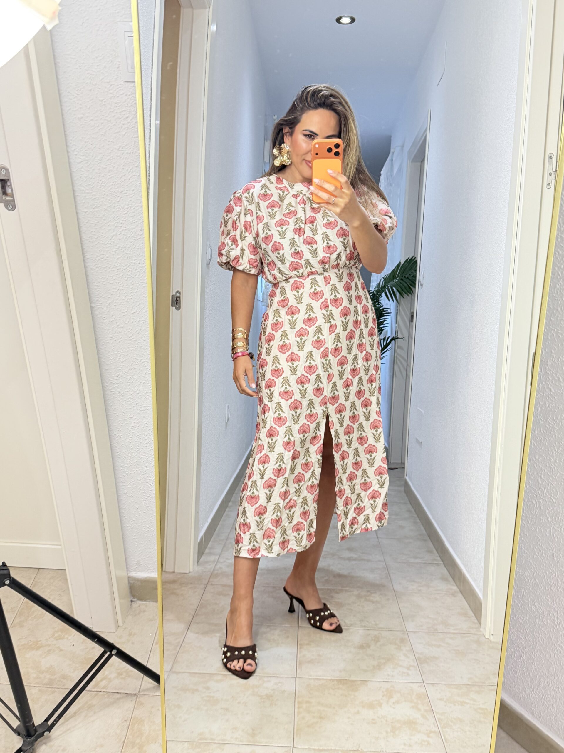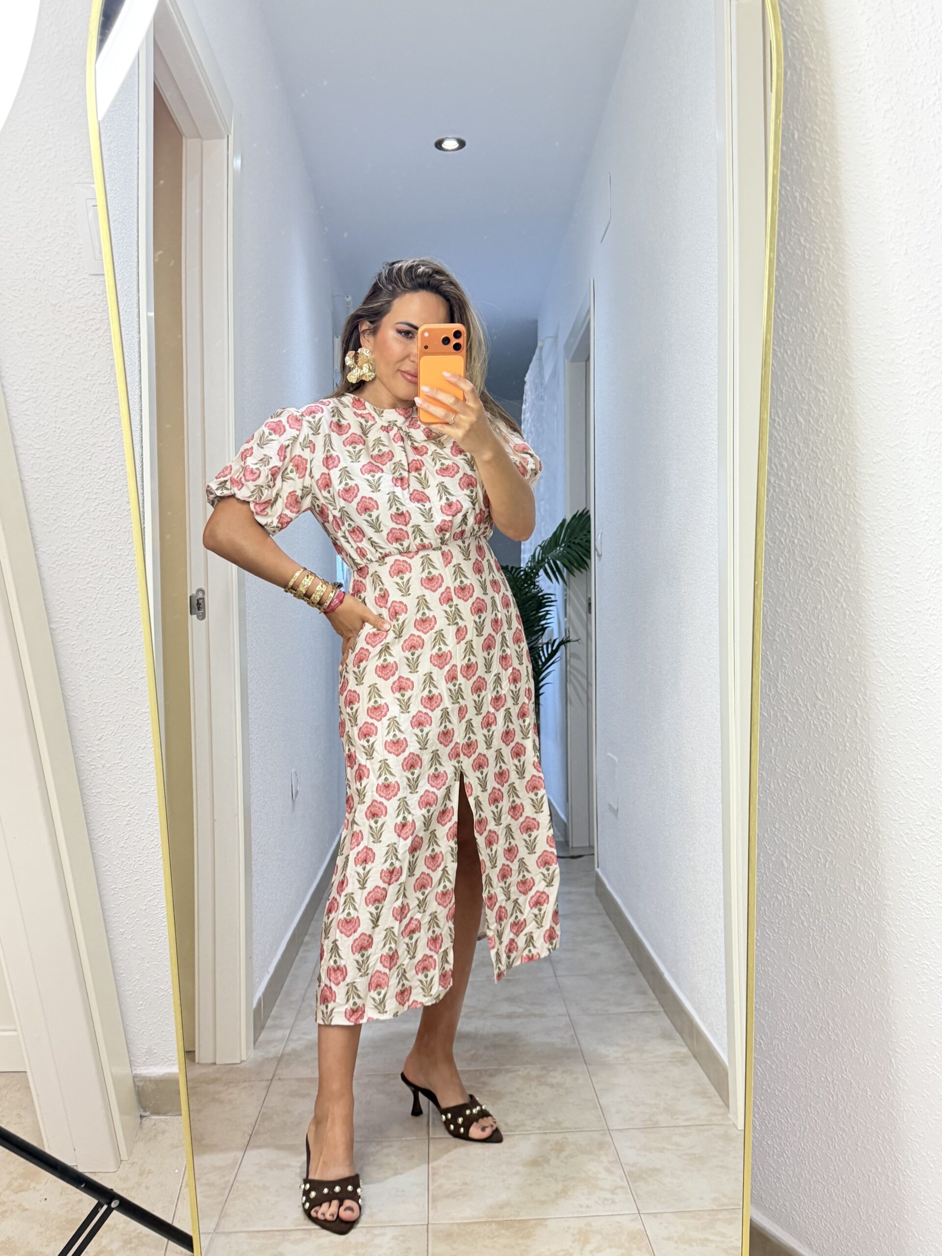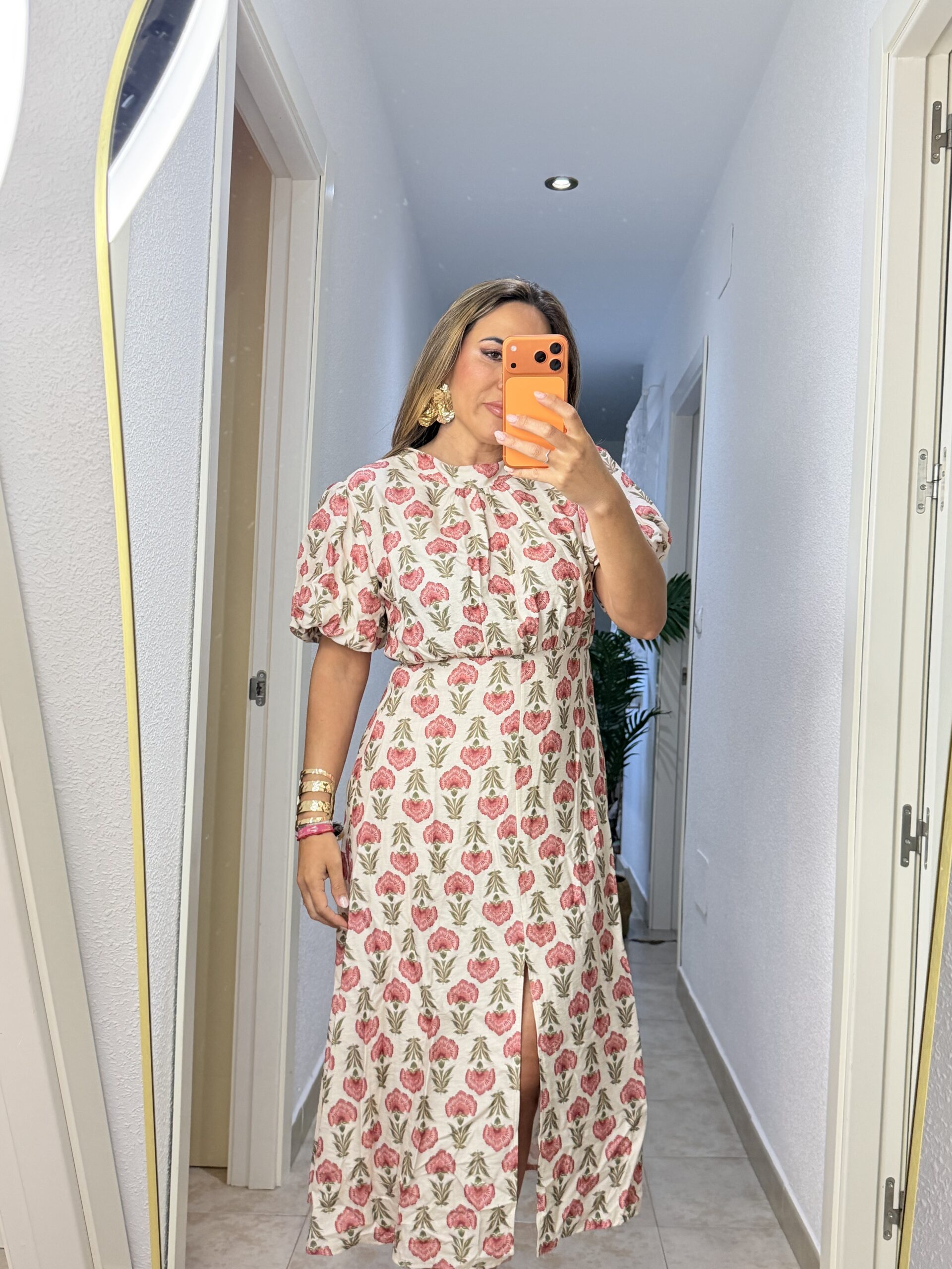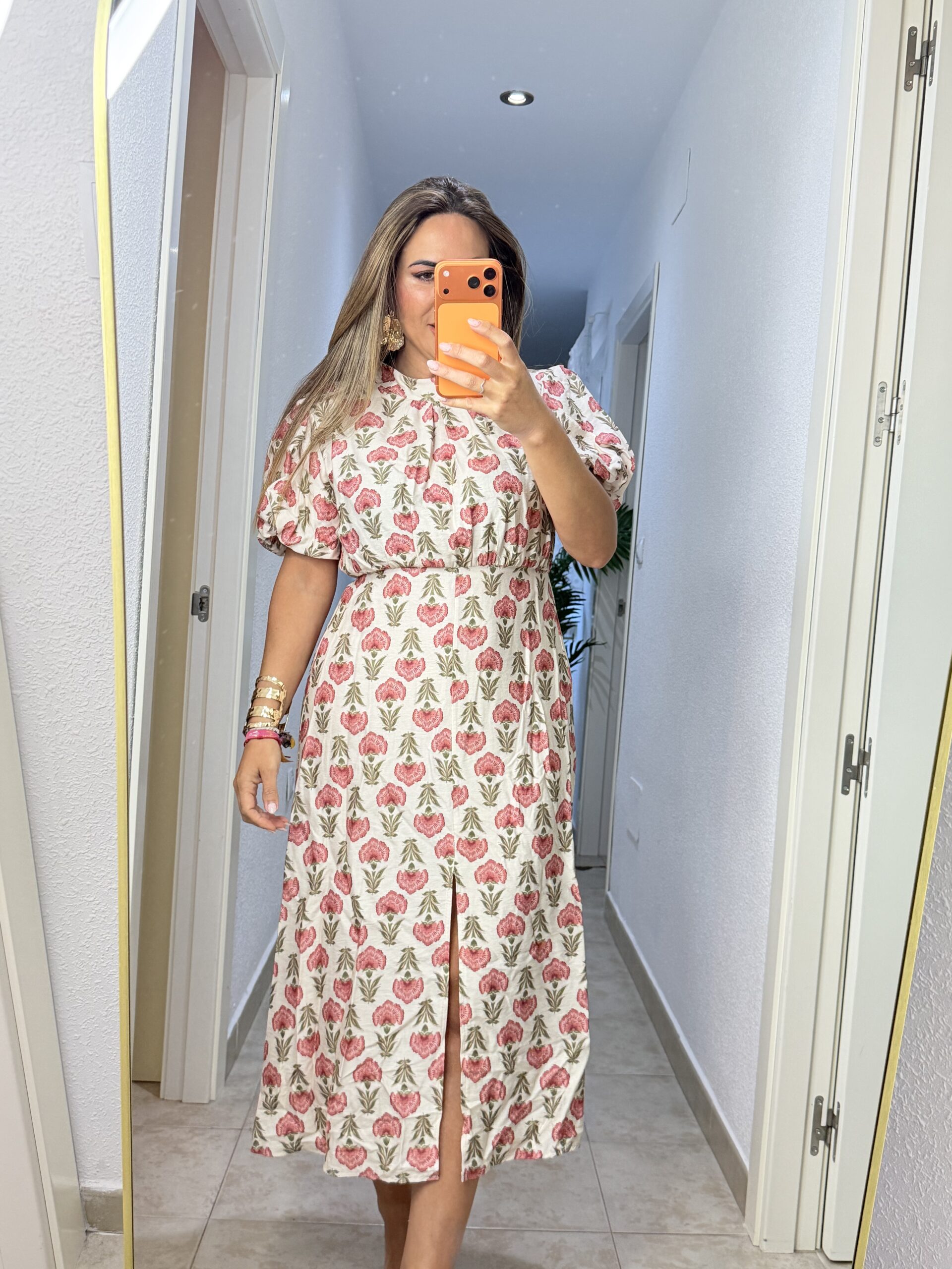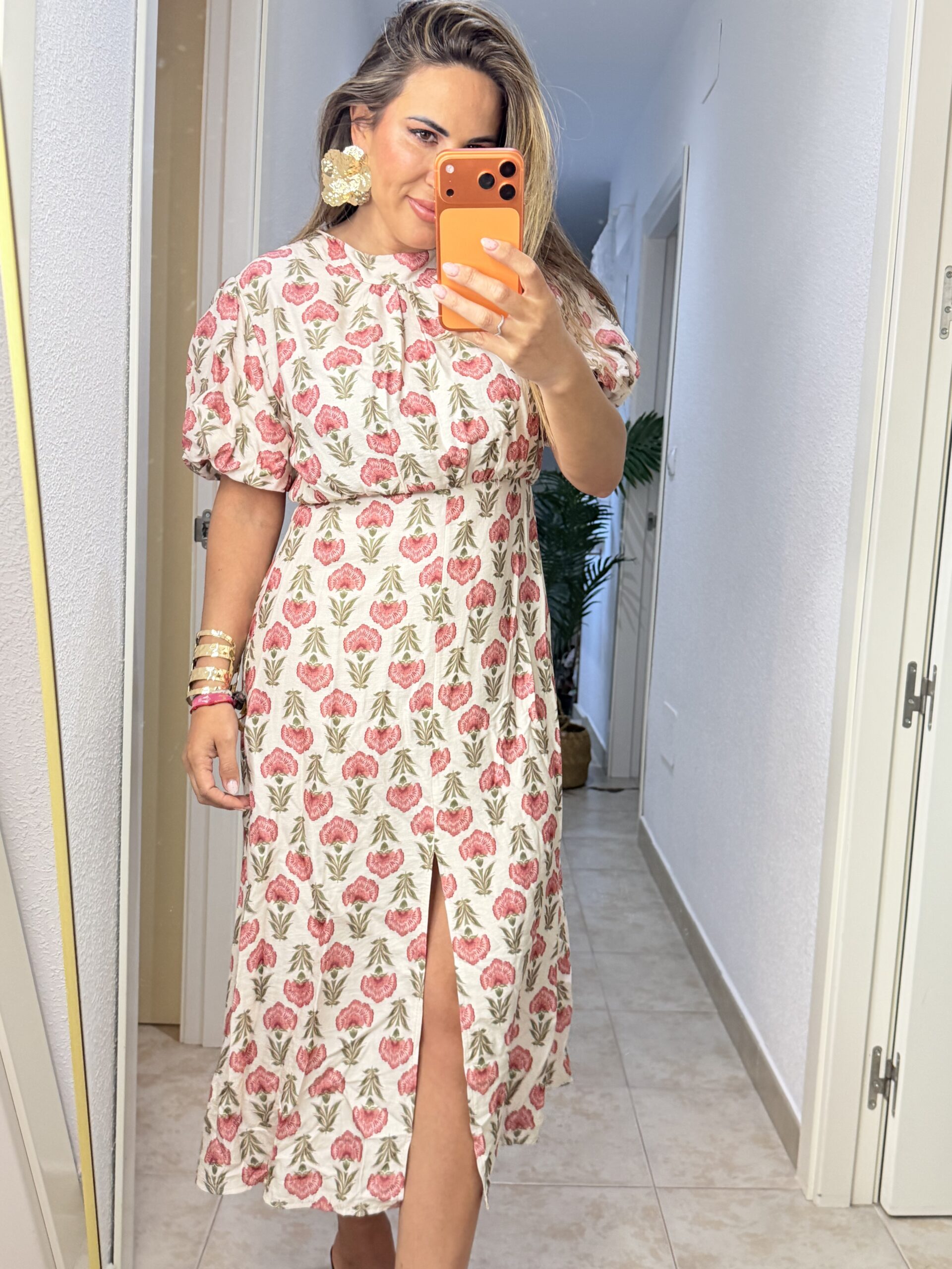 Vestido magnolia con detalle de manga abullonada y corte en la parte delantera, corte midi. Talla única, medida de contorno 100 cm.